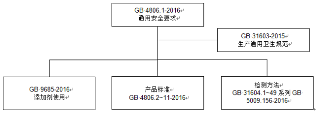 新的食品安全国家标准体系包括:① 通用安全要求GB 4806.1-2016;②生产通用卫生规范 GB 31603-2015; ③ 添加剂标准 GB 9685-2016;④ 产品标准 GB 4806.2~10 系列,共10个;⑤ 检测方法标准 GB 31604.1~49系列和GB 5009.156-2016 共50个。